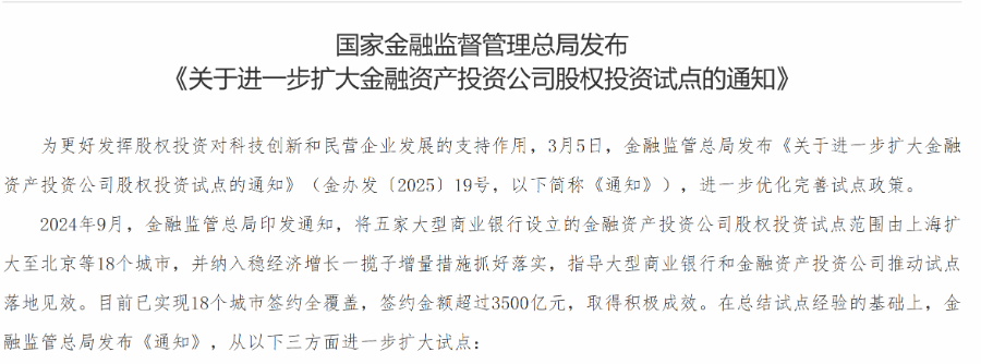 AIC的大举入场与政策支持有着紧密联系。2024年9月,金融监管总局将金融资产投资公司股权投资试点范围由上海扩大至北京等18个城市。2025年3月,国家金监总局发布《关于进一步扩大金融资产投资公司股权投资试点的通知》,称“支持符合条件的商业银行发起设立金融资产投资公司”。
