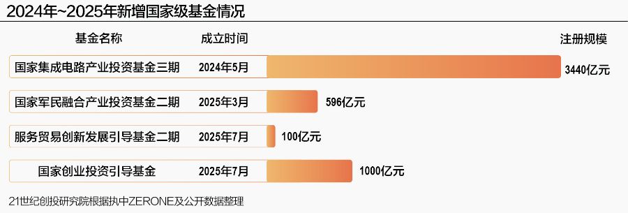 21世纪创投研究院统计发现,2025年新成立的国家级基金还有规模596亿元的国家军民融合产业投资基金二期、规模100亿元的服务贸易创新发展引导基金二期等。同时,国家中小企业发展基金二期的设立方案已获国务院批复,该基金也在筹备设立的过程中。在2024年,影响力最大的国家级基金为规模3440亿元的国家集成电路产业投资基金三期。